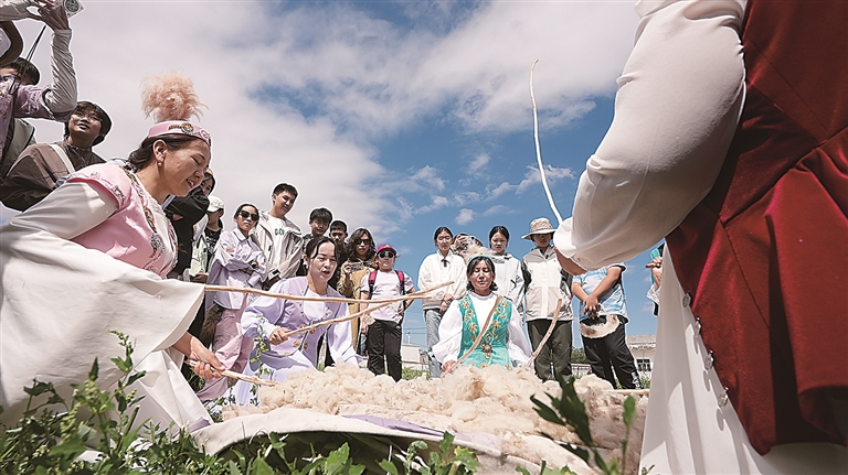 随后,游客们开始动手尝试。他们学着牧民的样子,小心翼翼地铺着羊毛,用力滚动木板,在欢声笑语中感受着传统技艺的魅力。“这是一次特别珍贵的体验!”河南游客杜鹤说。