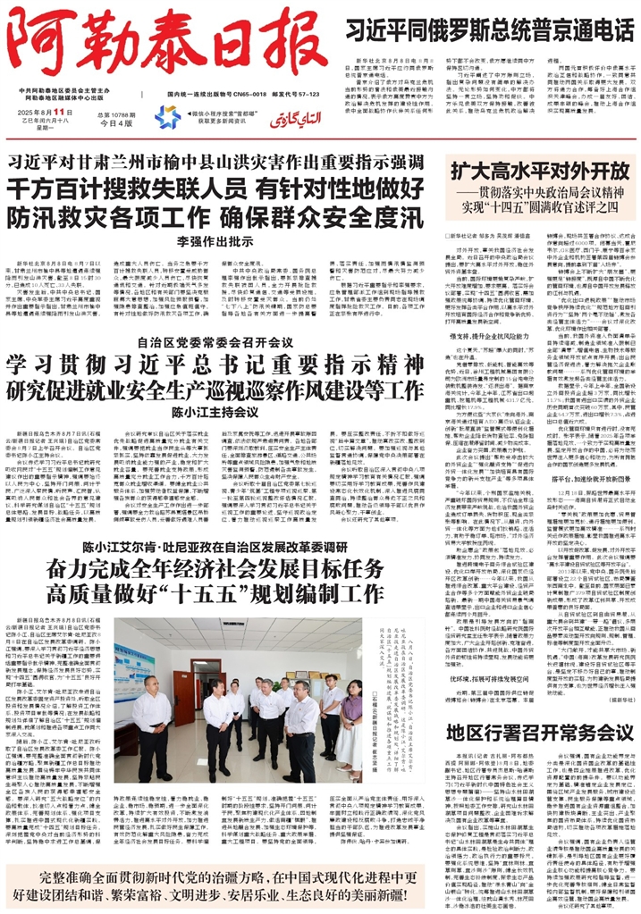 - 奋力完成全年经济社会发展目标任务 高质量做好“十五五”规划编制工作 新疆日报乌鲁木齐8月8日讯(石榴云/新疆日报记者 王兴瑞)自治区党委书记陈小江、自治区主席艾尔肯·吐尼亚孜8月8日在自治区发展改革委调研。陈小江强调,要深