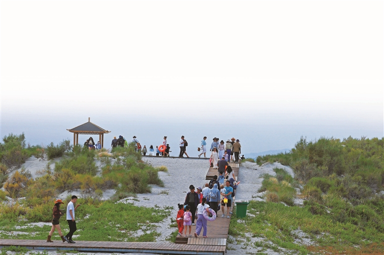 游客在福海县乌伦古湖黄金海岸景区游玩。