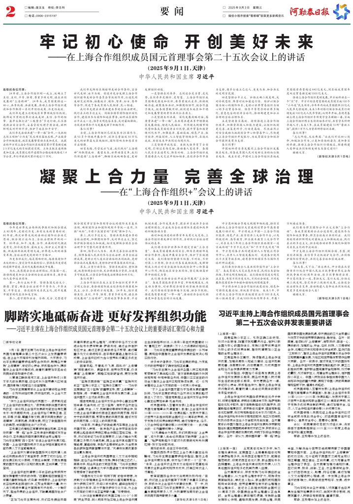 - 脚踏实地砥砺奋进 更好发挥组织功能 □新华社记者 9月1日,国家主席习近平在上海合作组织成员国元首理事会第二十五次会议上发表重要讲话,