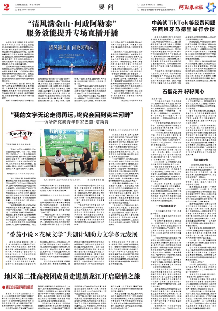 - “我的文字无论走得再远,终究会回到克兰河畔” □记者 张楠 实习记者 彭林海 “我的文字无论走得再远,终究会回到克兰河畔。”9月13日,“我的家乡 我的亲人”——《克兰河畔》新书发布会结束后,青年作家巴燕·塔斯肯