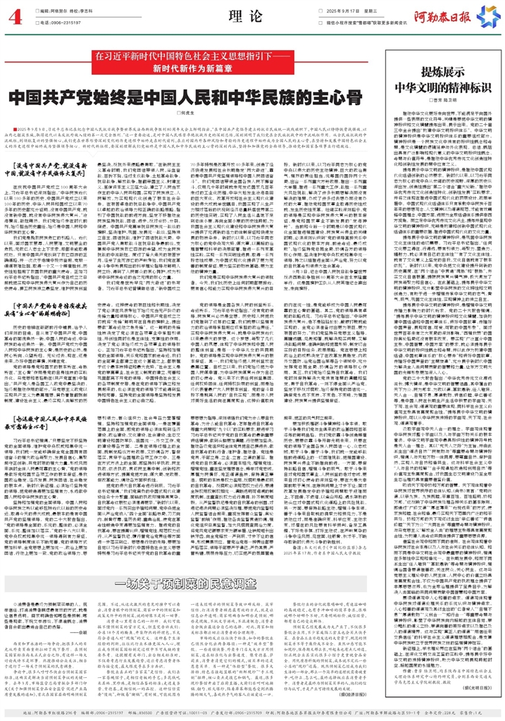 - 中国共产党始终是中国人民和中华民族的主心骨 □何虎生 ■2025年9月3日,习近平总书记在纪念中国人民抗日战争暨世界反法西斯战争胜利80周年大会上鲜明指出,“在中国共产党倡导建立的抗日民族统一战线旗帜下,中国人民