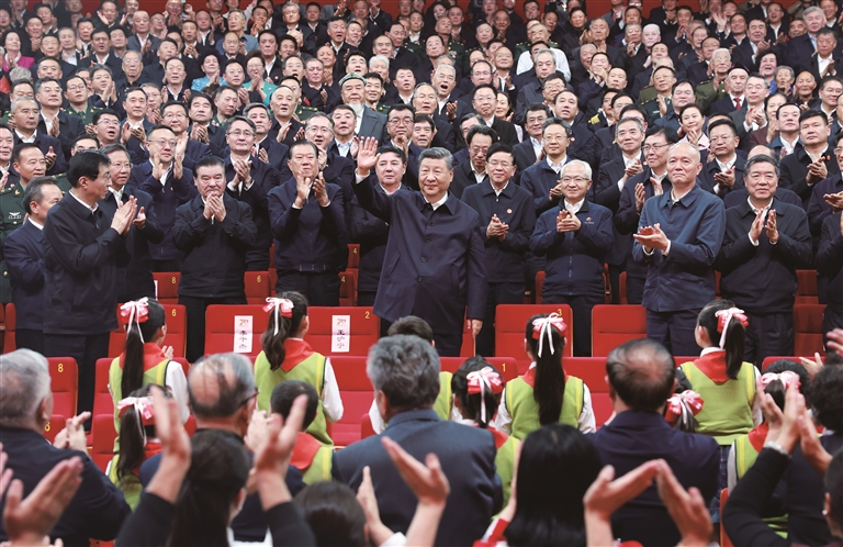 王沪宁、蔡奇、李干杰、何立峰、王小洪、雪克来提·扎克尔、谌贻琴、王东峰和刘振立,在新疆工作过的老同志,以及中央和国家机关有关部门负责同志、中央代表团全体成员一同观看演出。