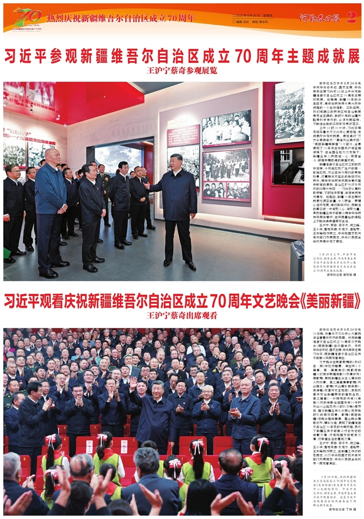 - 习近平观看庆祝新疆维吾尔自治区成立70周年文艺晚会《美丽新疆》 新华社乌鲁木齐9月24日电 24日晚,乌鲁木齐文化中心大剧院洋溢着喜庆热烈的氛围。庆祝新疆维吾尔自治区成立70周年文艺晚会《美丽新疆》在这里举行。中共中央总书记、国家主席、中央军委主席习