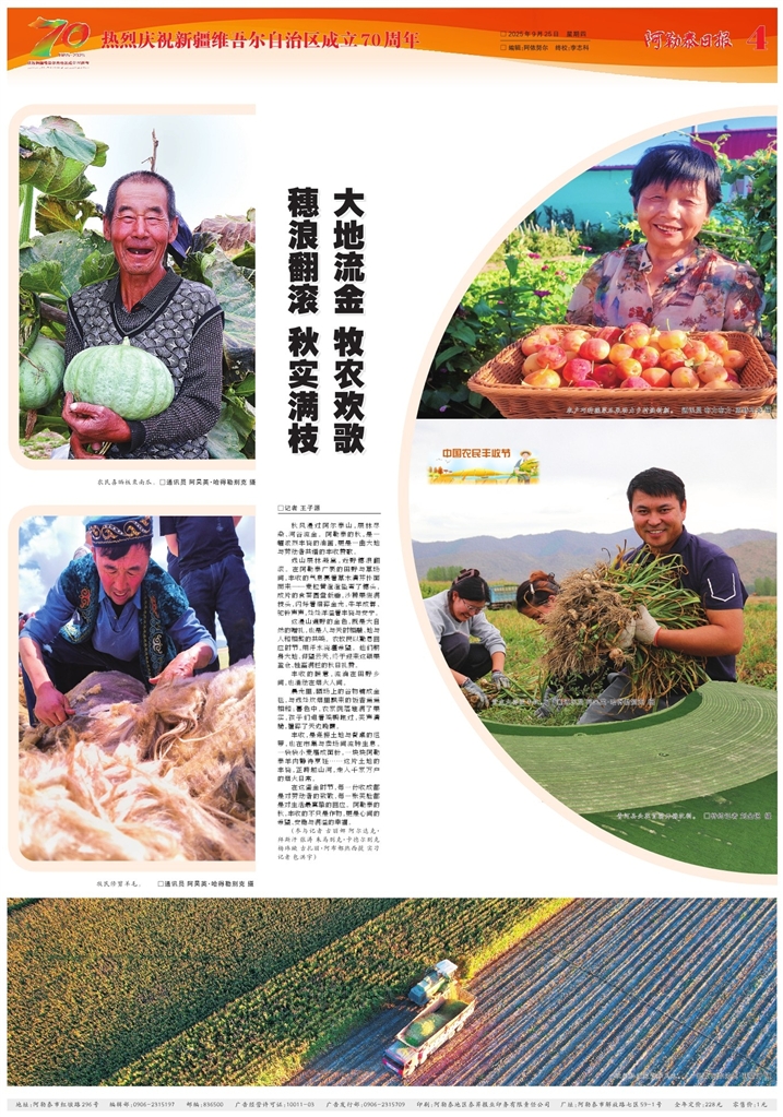 • 穗浪翻滚 秋实满枝 大地流金 牧农欢歌        □记者 王子源      秋风漫过阿尔泰山,层林尽染、河谷流金。阿勒泰的秋,是一幅浓烈丰饶的油画,更是一曲大地与劳动者共谱的丰收赞歌。   远山层林凝黛,近野穗浪翻滚。在阿勒