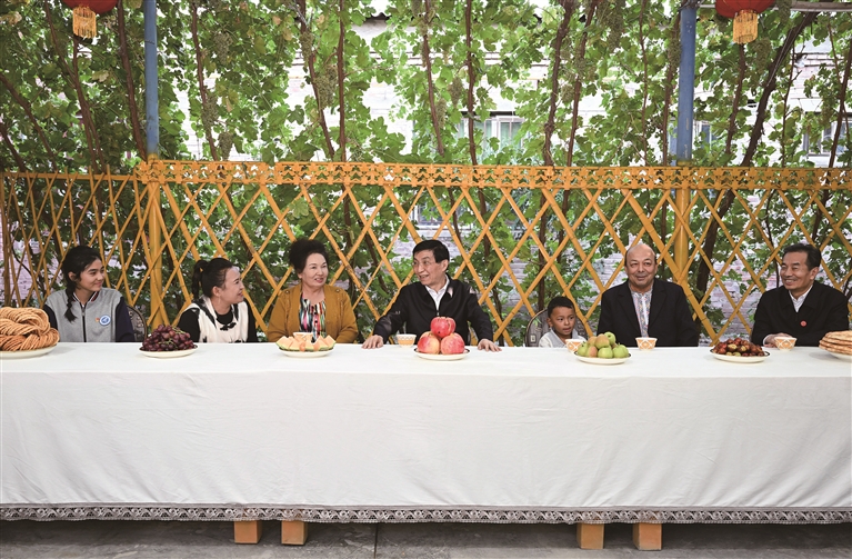 九月二十五日下午,受习近平总书记嘱托,中共中央政治局常委、全国政协主席、中央代表团团长王沪宁带领中央代表团部分成员在巴音郭楞蒙古自治州库尔勒市看望慰问当地各族干部群众。这是王沪宁和中央代表团部分成员在库尔勒市阿瓦提乡吾夏克铁热克村了解乡村产业发展和群众生产生活情况。 新华社记者 张领 摄