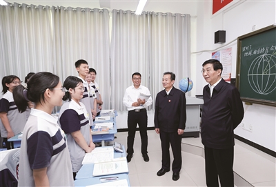 九月二十五日下午,受习近平总书记嘱托,中共中央政治局常委、全国政协主席、中央代表团团长王沪宁带领中央代表团部分成员在巴音郭楞蒙古自治州库尔勒市看望慰问当地各族干部群众。这是王沪宁和中央代表团部分成员在库尔勒市第二十三中学考察教育援疆情况。