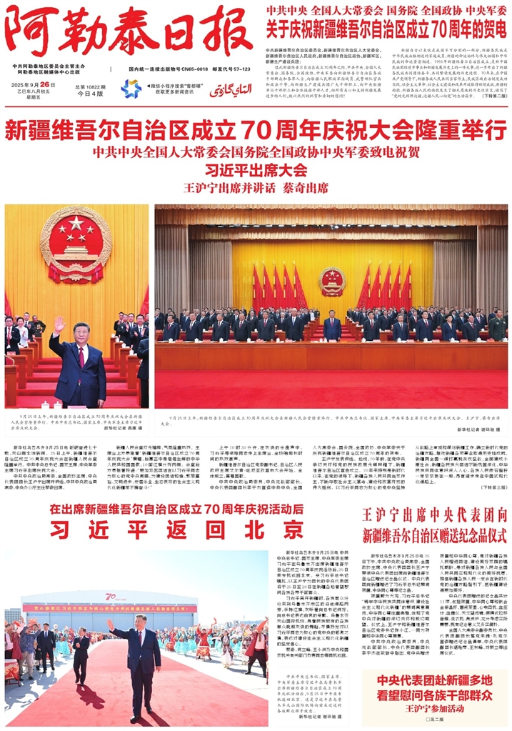 - 习近平返回北京 新华社乌鲁木齐9月25日电 中共中央总书记、国家主席、中央军委主席习近平在乌鲁木齐出席新疆维吾尔自治区成立70周年庆祝活动后,25日乘专机返回北京。受习近平总书记嘱托,以王沪宁为团长的中央