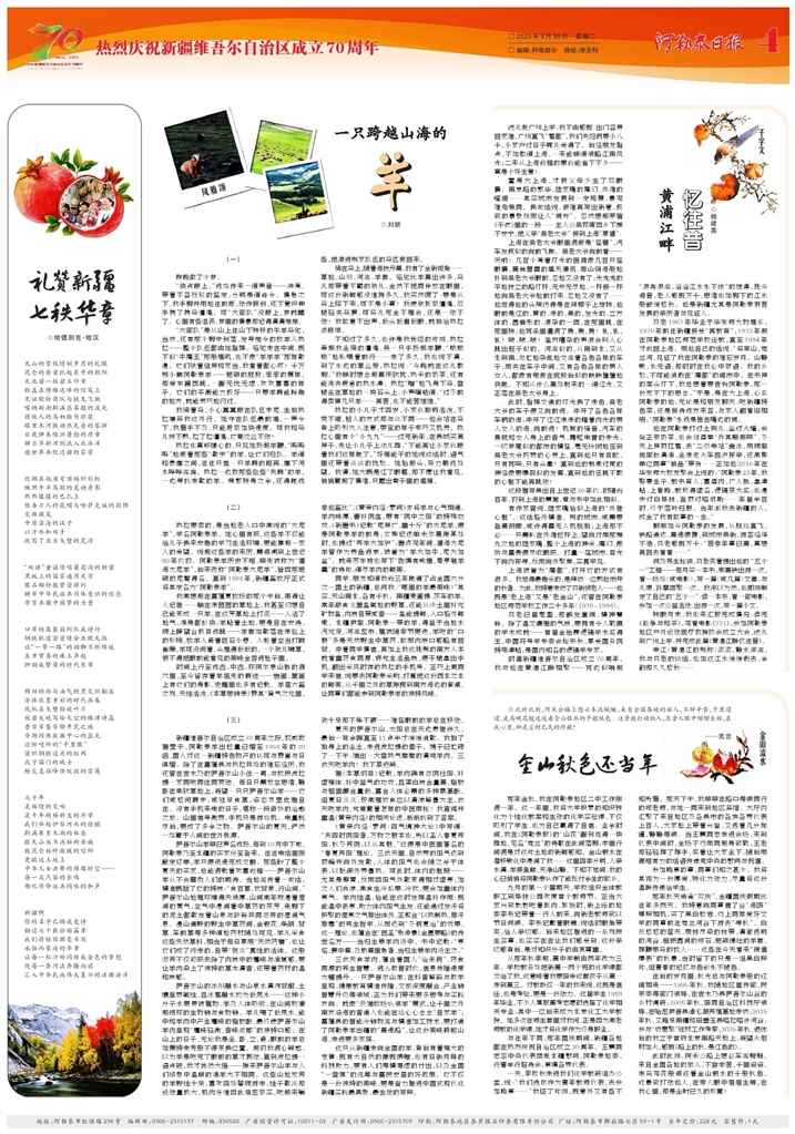 - 礼赞新疆 七秩华章 ◎哈德别克·哈汉 天山的雪线缝制岁月的礼服 昆仑的脊梁托起东升的朝阳 天池若一枚碧玉印章 钤盖在博格达峰的信笺上 见证驼铃商队与铁龙飞驰