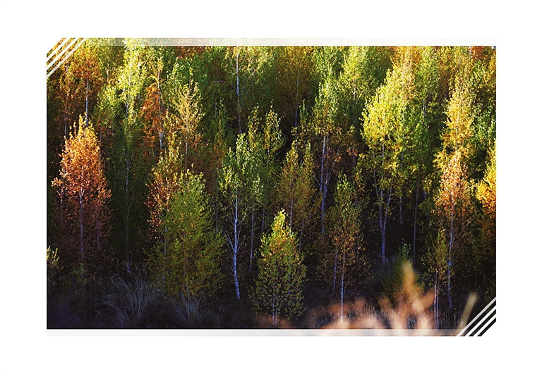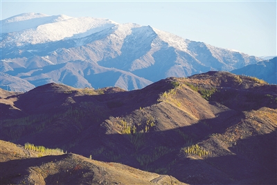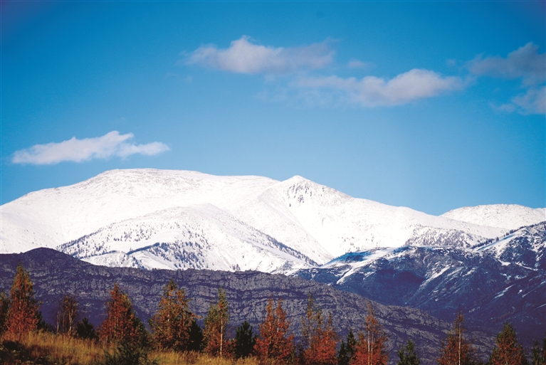 绯红灌木点染谷间,墨绿云杉挺拔而立,白桦与杨树披金摇曳,与皑皑雪峰交相辉映。随着海拔攀升,植被色彩渐次铺展,形成清晰的垂直带谱——斑斓色块顺山势流泻,宛若天地倾翻的调色盘。银装素裹的雪峰为这抹秋色勾勒出纯净轮廓,更添几分诗意,每一寸土地仿佛都被秋光浸透。