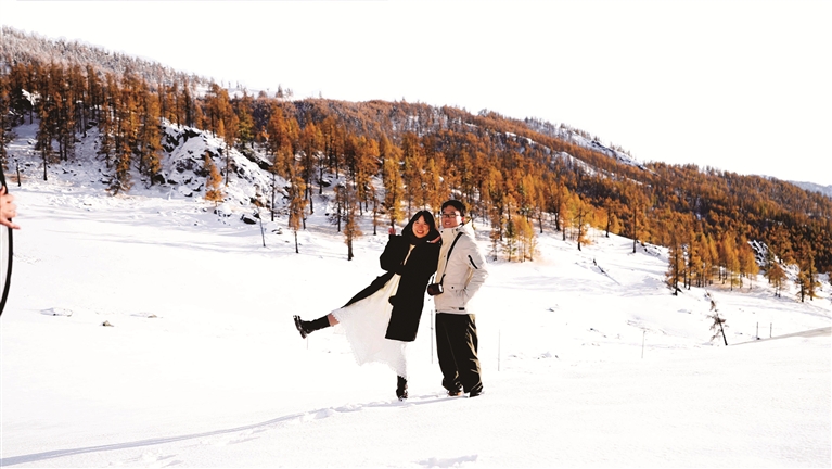 10月8日,第三次到访新疆的深圳游客李金鸿和潘蔚萱,举着手机追着雪花拍个不停。“秋的暖、冬的凉,竟能靠得这么近!我们从深圳的三十摄氏度奔赴阿勒泰的零摄氏度,一路走过金秋又邂逅初雪,简直是‘买’秋还送冬,太奇妙了!”