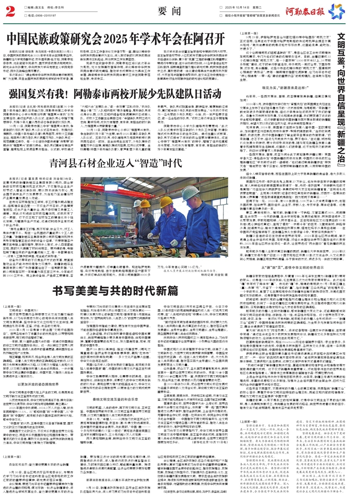 - 中国民族政策研究会2025年学术年会在阿召开 本报讯(记者 胡俊秀 朱马别克·卡德尔别克)10月11日,中国民族政策研究会2025年学术年会在阿勒泰召开。新疆财经大学党委副书记、校长居来提·吐尔地,阿勒泰地委委员、统战部部长姚奇
