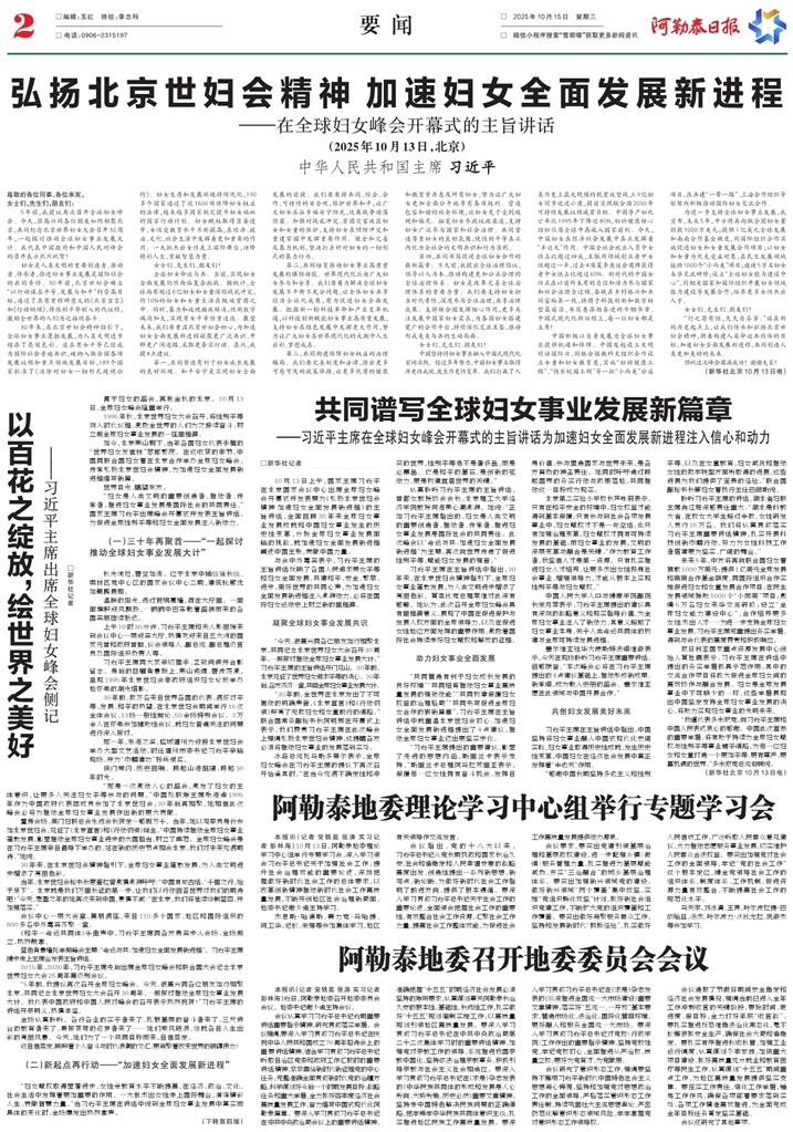 - 共同谱写全球妇女事业发展新篇章 □新华社记者 10月13日上午,国家主席习近平在北京国家会议中心出席全球妇女峰会开幕式并发表题为《弘扬北京世妇会精神 加速妇女全面发展新进程》的主旨讲