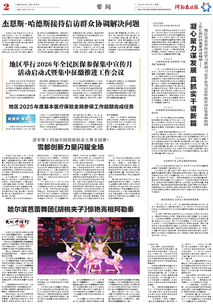 - 地区举行2026年全民医保参保集中宣传月 活动启动式暨集中征缴推进工作会议 本报讯(记者 古扎丽·阿布都热西提 实习记者 彭林海)10月16日,地区举行2026年全民医保参保集中宣传月活动启动仪式暨集中征缴推进工作会议,地委委员叶尔波拉提·巴依哈旦出席会