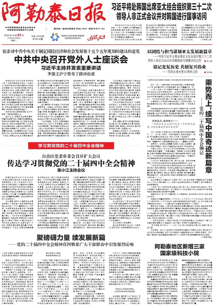 - 聚磅礴力量 续发展新篇 □记者 常轶茹 古丽娜 胡俊秀 实习记者 王景鸿 通讯员 胡阿尼什·那斯哈提 蔡瑞刚 党的二十届四中全会于10月20日至23日在北京举行。会议审议通过