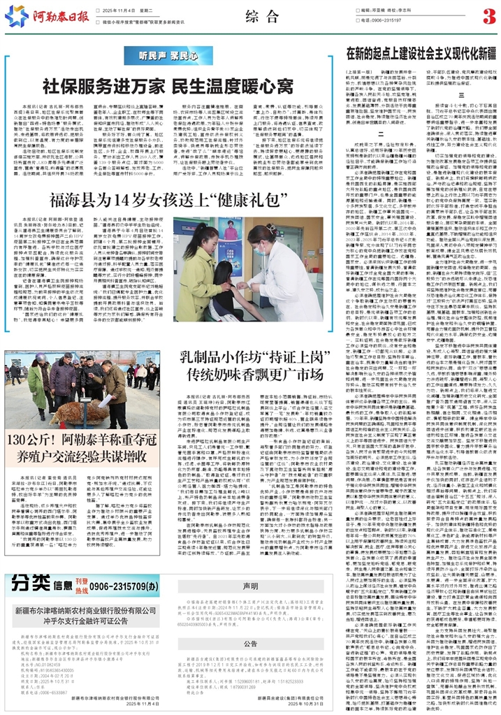 “乳制品加工是阿勒泰市的特色优势产业,小作坊更是连接农户与市场的重要纽带。”阿勒泰市动物卫生监督所副所长夏力哈尔别克·阿努瓦尔表示,下一步将继续深化与相关部门的协同配合,一方面持续加强源头监管,确保每一批原料都符合标准;另一方面加大对小作坊的技术指导与政策扶持力度,助力更多乳制品小作坊实现“从小到大、从散到优”的转型升级,推动传统奶制品产业成为乡村产业振兴的重要增长点,为阿勒泰市经济高质量发展注入新动能。