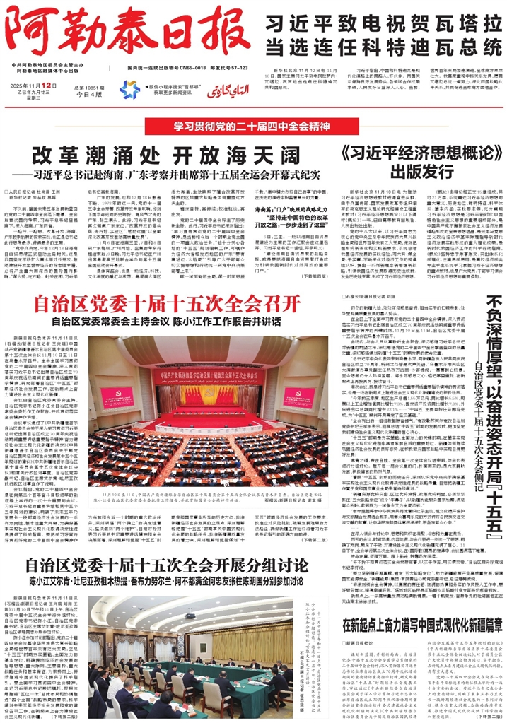 - 不负深情厚望,以奋进姿态开局“十五五” □石榴云/新疆日报记者 刘翔 初冬的新疆大地,处处可见感恩奋进、担当实干的忙碌身影,处处显现高质量发展的喜人势头。 在全区上下全面学习贯彻党的二十届四中全会精神,深入贯彻落实习近平总