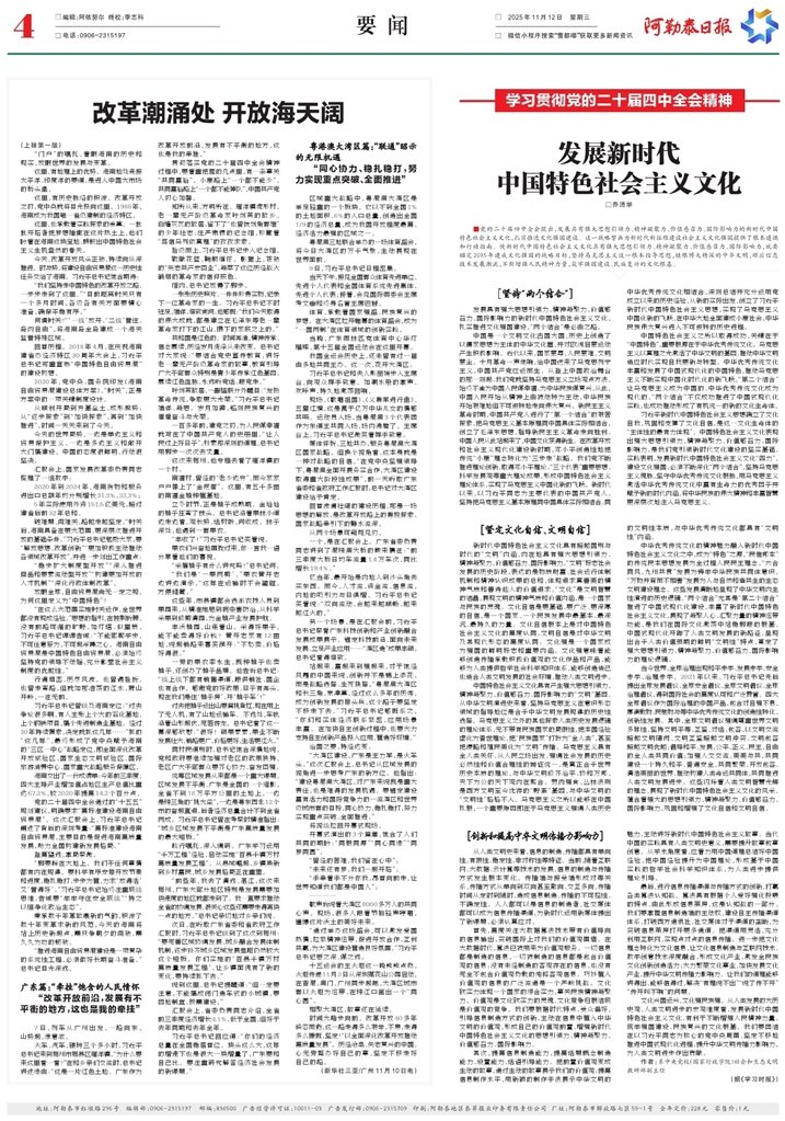 • 发展新时代 中国特色社会主义文化               □乔清举      ■党的二十届四中全会提出,发展具有强大思想引领力、精神凝聚力、价值感召力、国际影响力的新时代中国特色社会主义文化,扎实推进文化强国建设。这一战略擘画为新
