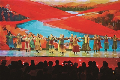 《花毡献给亲爱的党》以非遗技艺毡绣、布绣及擀毡、捻毡劳动场景为题材,以庆祝自治区成立70周年为创作核心。当晚,欢快的音乐响起,身着融入花毡纹样服饰的舞者踏步登场,她们以灵动身姿模拟擀毡、绣纹等场景,裙摆飞扬间带起阵阵风。演员们的热情与观众们的欢呼声交织在一起,在“非遗”花毡中“秀”出阿勒泰人民的美好生活和对党的热爱。