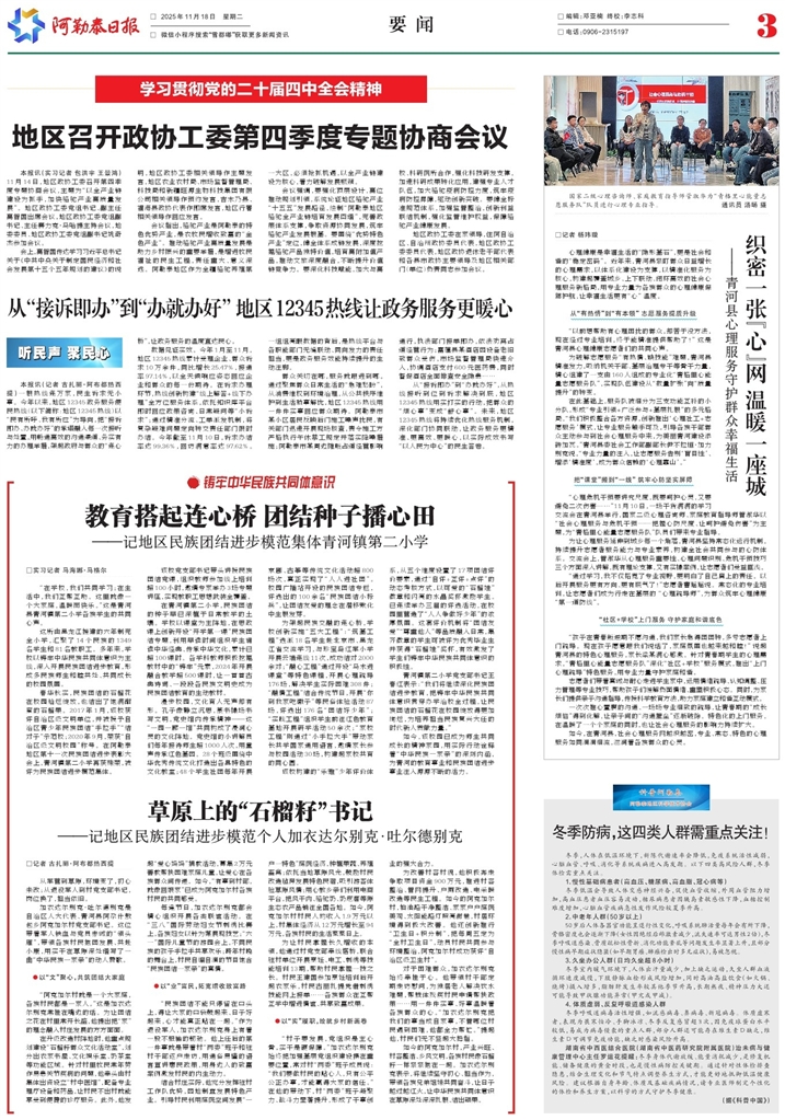 - 草原上的“石榴籽”书记 □记者 古扎丽·阿布都热西提 从军营到草原,环境变了,初心未改;从退役军人到村党支部书记,岗位换了,担当依旧。 加衣达尔别克·吐尔德别克是自治区人