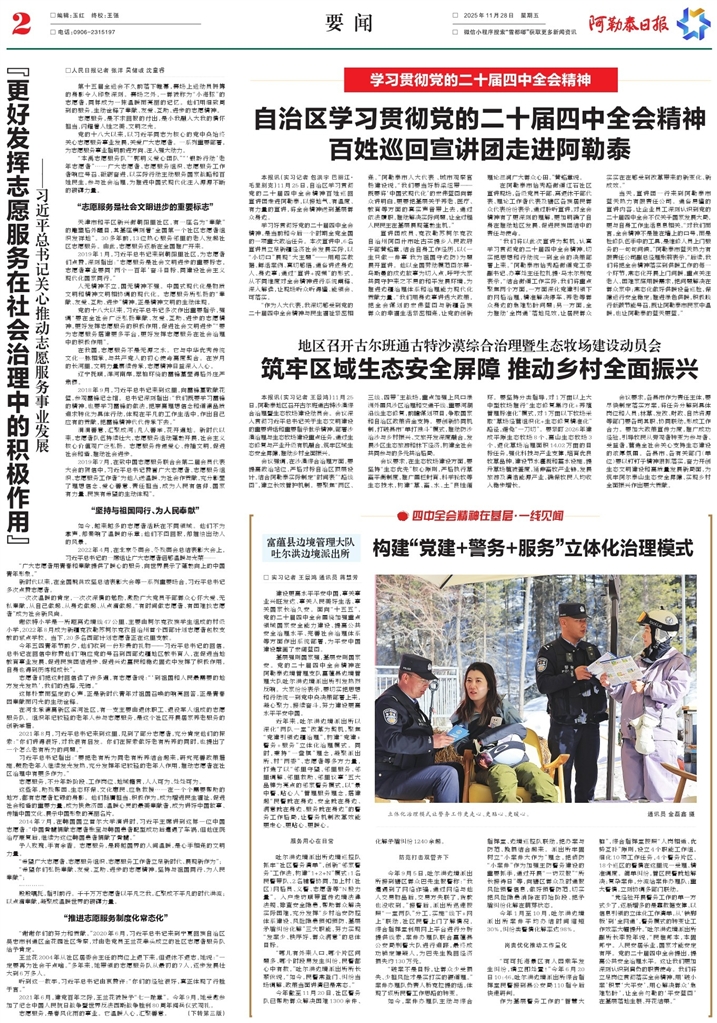 - 自治区学习贯彻党的二十届四中全会精神 百姓巡回宣讲团走进阿勒泰 本报讯(实习记者 包洪宇 巴丽江·毛里别克)11月25日,自治区学习贯彻党的二十届四中全会精神百姓巡回宣讲团走进阿勒泰,以接地气、有温度、有力量的宣讲,将全会精神送到基层群众身边