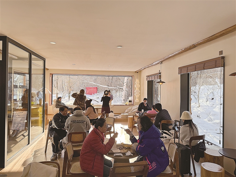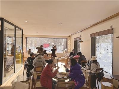 桦林公园内,桦树枝桠覆着薄雪,清冽雅致的冬日风光尽显雪都韵味。父母陪伴孩子的身影随处可见,大家或在林间踏雪嬉戏、定格亲子雪景合影,或驻足休憩感受冬日静谧,沉浸式解锁雪假休闲时光。其中,由园内1号屋改造而成的“喂山风”咖啡屋人气高涨,成为亲子打卡与游客休闲的必选之处:屋内暖意融融,游客们手捧咖啡临窗而坐,不少家庭围坐一桌,伴着窗外雪林光影共享温馨时光;屋外红墙、木屋与覆雪桦树相映成趣,自然景致与人文场景碰撞出独特韵味,引得游人及亲子家庭纷纷拍照留念。