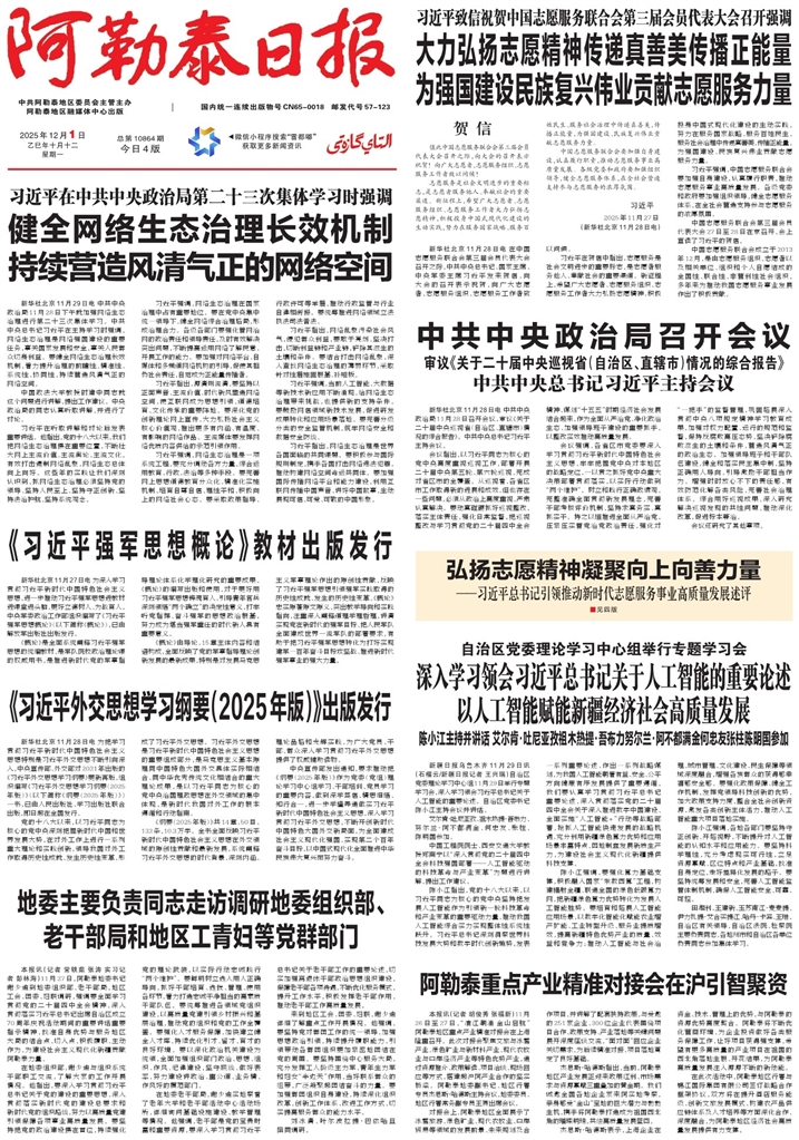 - 深入学习领会习近平总书记关于人工智能的重要论述 以人工智能赋能新疆经济社会高质量发展 新疆日报乌鲁木齐11月29日讯(石榴云/新疆日报记者 王兴瑞)自治区党委理论学习中心组11月29日举行专题学习会,深入学习领会习近平总书