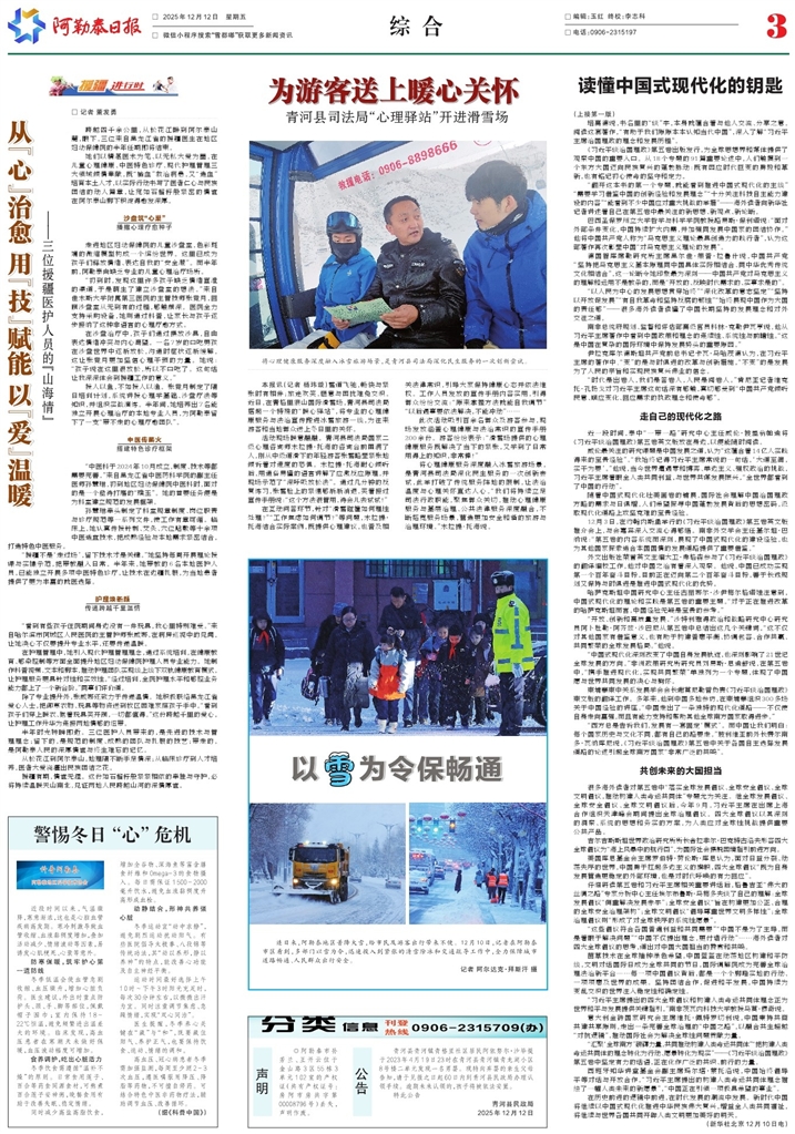 - 从“心”治愈 用“技”赋能 以“爱”温暖 □ 记者 董发勇 跨越四千余公里,从松花江畔到阿尔泰山麓,眼下,三位来自黑龙江省的援疆医生在地区妇幼保健院的半年任期即将结束。 她们以精湛医术为笔、以无私大爱为