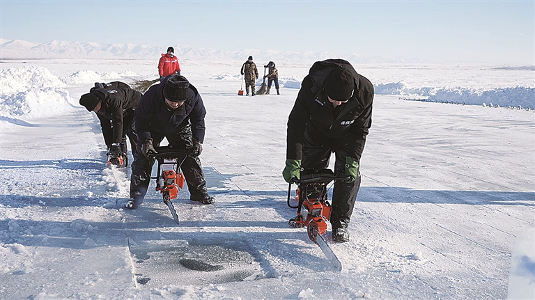 上午12时,随着油锯轰鸣声响起,采冰仪式正式启动。冰封的湖面上,受邀嘉宾与采冰工人共同见证“采头冰”这一承载吉祥寓意的时刻。项目总负责人张喜庆手持工具破冰启采,寓意“开冰纳福”,采冰工人们默契协作,把晶莹剔透的“头冰”缓缓移出水面,现场掌声与欢呼声交织。