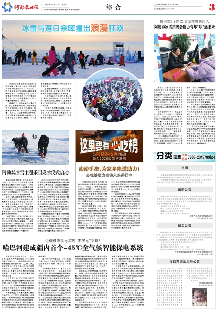 本报讯(记者 董世菊 通讯员 赵巧)12月12日,2025—2026年首届人类滑雪起源地冰雪文化节核心活动——阿勒泰冰雪主题乐园采冰仪式,在阿勒泰市阿苇滩水库举行。这场融合古老民俗智慧与现代文旅愿景的仪式,为北纬45°黄金雪域线拉开了今冬冰雪盛宴的序幕。