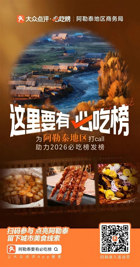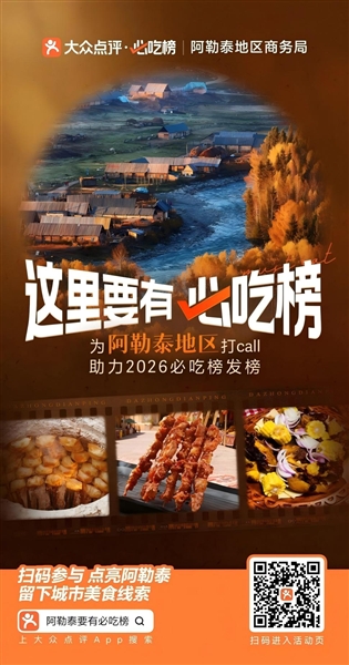 本报讯(实习记者 马海娜·马格尔)即日起,阿勒泰的美食爱好者们多了一项新任务:动动手指,为心仪的家乡味道助力!近日,记者从地区商务局获悉,该局联合大众点评平台推出“这里要有必吃榜”主题活动,邀请居民、游客和美食达人共同挖掘、展示阿勒泰的地道美食线索,为阿勒泰冲刺2026年必吃榜汇聚人气、积蓄能量。