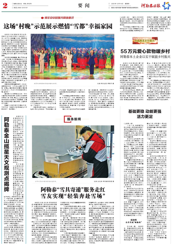 - 这场“村晚”示范展示燃情“雪都”幸福家园 本报讯(记者 董世菊 阿尔达克·拜斯汗 实习记者 巴丽江·毛里别克)12月16日下午,由新疆文化馆、 阿勒泰地区文化体育广播电视和旅游局主办,阿勒泰地区文化馆、中共阿勒泰市委员会宣传部