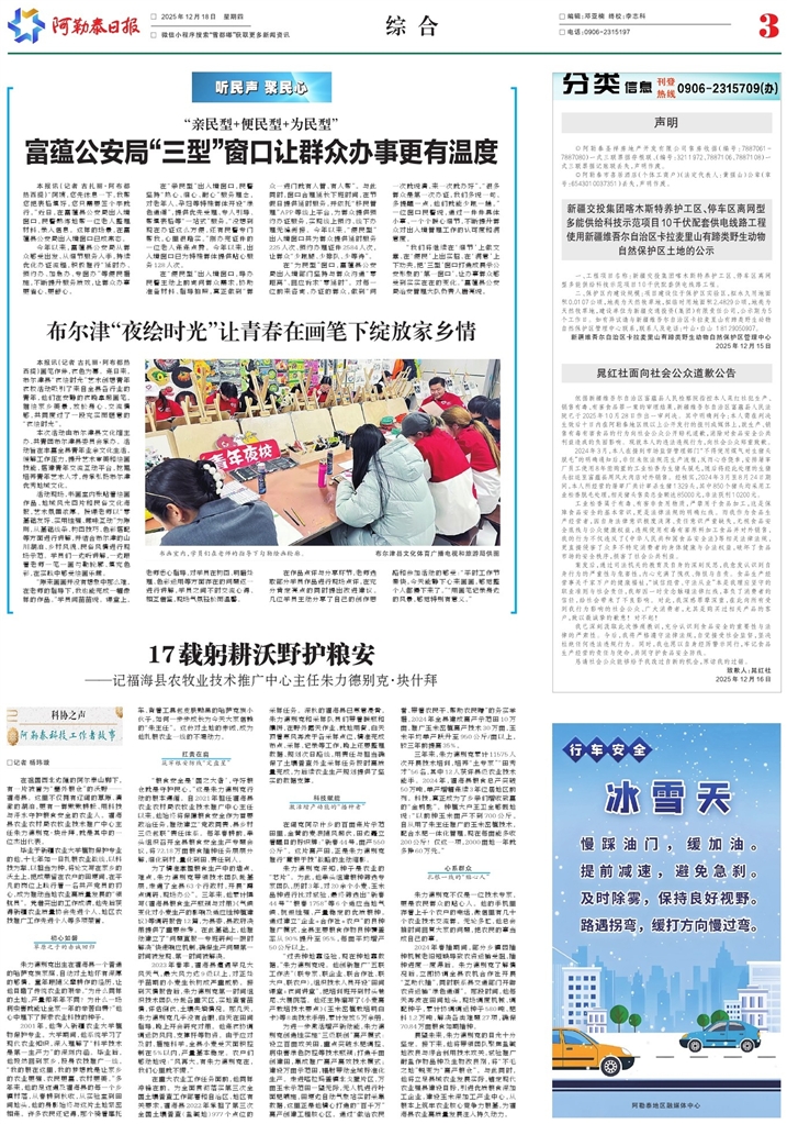 - 17载躬耕沃野护粮安 □记者 杨玮璇 在祖国西北边陲的阿尔泰山脚下,有一片被誉为“塞外粮仓”的沃野——福海县。这里不仅拥有辽阔的草原、