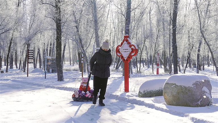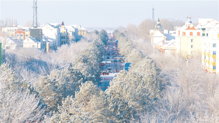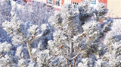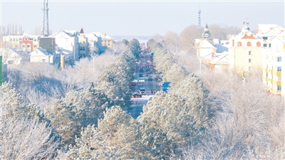 连日来,县城道路两旁蓝天白云相映成趣,枝头被层层叠叠的霜花裹得莹白透亮,微风拂过,雪花簌簌飘落,一步一景皆是“雾凇沆砀,天与云与山与水,上下一白”。