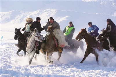 文艺演出率先开场,民族舞蹈、冬不拉弹唱等群众自编自演的节目轮番上演,展现了浓郁的民俗文化底蕴和民族团结的生动景象,台下掌声与喝彩声不断。随后,射箭、刁羊、姑娘追、押加、摔跤等特色民俗竞技项目接连开赛。选手们奋力角逐,观众热情助威,冬日乡村洋溢着热闹祥和的气氛。