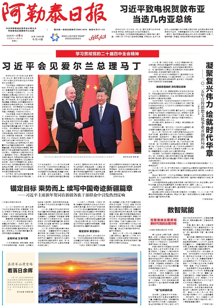 - 锚定目标 乘势而上 续写中国奇迹新疆篇章 □石榴云/新疆日报记者 二〇二六年到来之际,国家主席习近平发表新年贺词,深情回顾“十四五”时期极不寻常的奋斗历程,满怀信心展望“十五五”新的奋进征程,