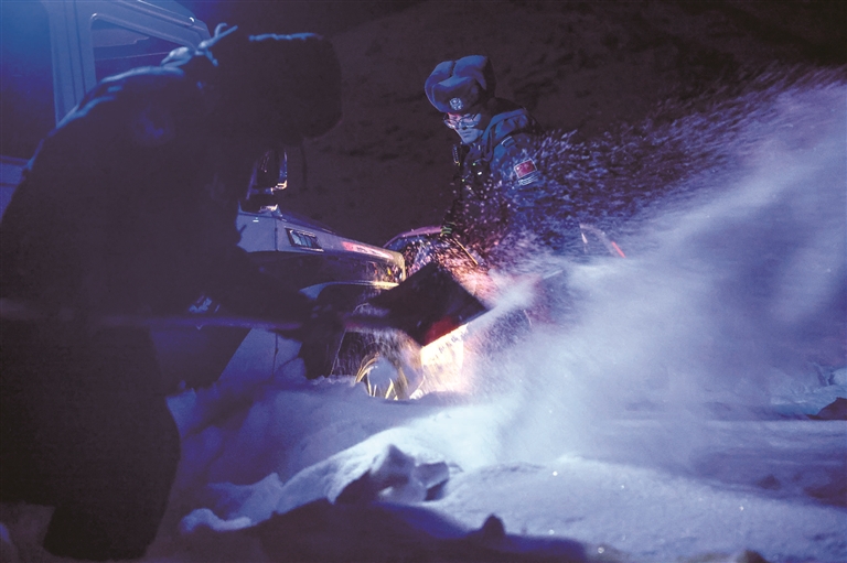 1月3日凌晨4时许,阿勒泰边境管理支队吐尔洪边境派出所接到群众紧急求助,因操作不当,车辆陷入雪窝,无法脱困。民警立即携带救援装备,顶着寒风奔赴现场。