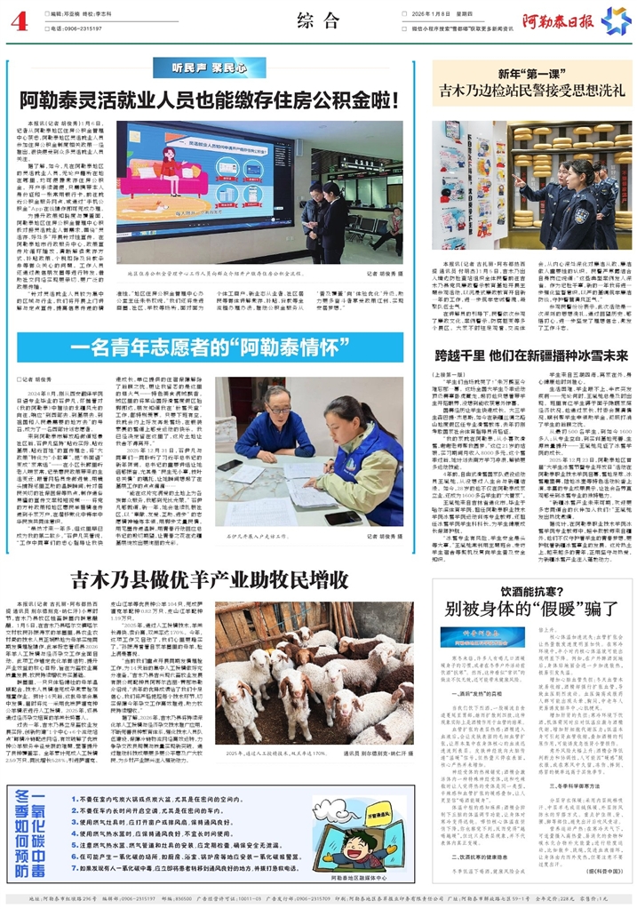 - 吉木乃县做优羊产业助牧民增收 本报讯(记者 古扎丽·阿布都热西提 通讯员 别尔德别克·纳仁汗)小寒时节,吉木乃县牧区牲畜暖圈内暖意融融。1月5日,在吉木乃县喀尔交镇喀尔交村牧民孙振涛家的羊圈里,县农业农村局的技术人