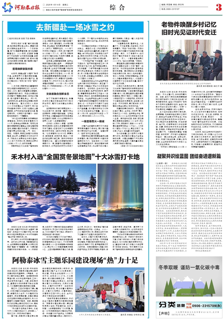- 阿勒泰冰雪主题乐园建设现场“热”力十足 本报讯(记者 古扎丽·阿布都热西提)连日来,阿勒泰冰雪主题乐园项目建设现场机器轰鸣、人声鼎沸,一派热火朝天的施工景象。在阿勒泰市阿苇滩水库,采冰作业同步推进,工作人员正有序进行凿冰、分