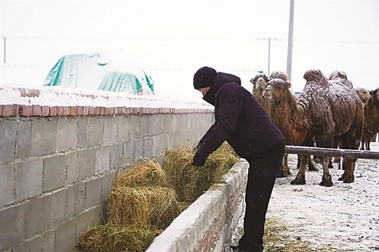1月14日,笔者走进富蕴县吐尔洪乡莫勒德尔村村民萨亚哈提·木尔山家中,只见院内暖圈整洁有序,青贮、干草等饲草料储备充足,20余峰骆驼正悠闲进食。萨亚哈提·木尔山说:“我养骆驼三年了,目前自家存栏20余峰,还有10余峰托付他人代养。家里提前储备了5吨青贮和1000捆干草,完全不用担心寒潮影响骆驼过冬。”