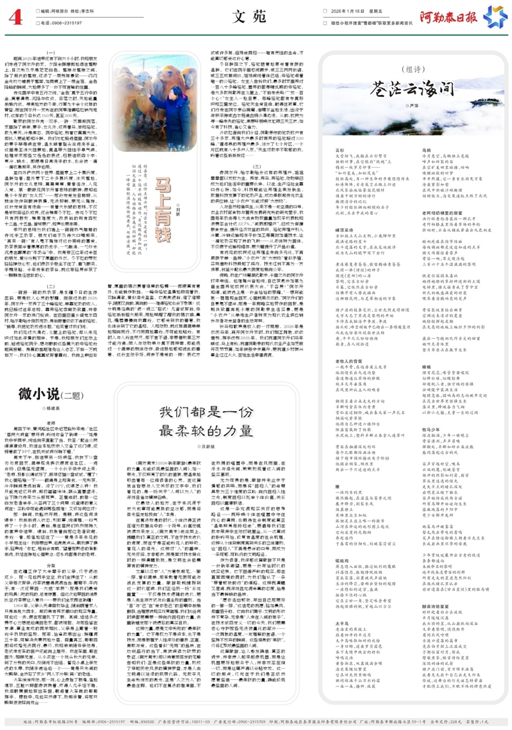 - 我们都是一份 最柔软的力量 ◎贝新祯 《南方周末》2026新年献辞《最柔软的力量,也能修筑最坚固的人间》,如一束光,不仅照亮了时代的褶皱,更温柔地叩击着每一位阅读者的心灵。在这篇饱含哲思与人