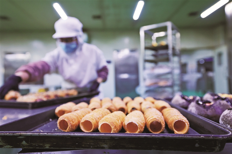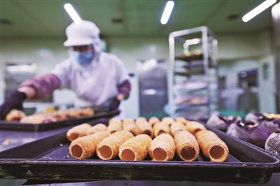 1月21日,福海县新疆丰吉尔食品有限公司生产车间内机器轻鸣,流水线匀速运转,工人们有序进行糕点制作、分拣与包装。