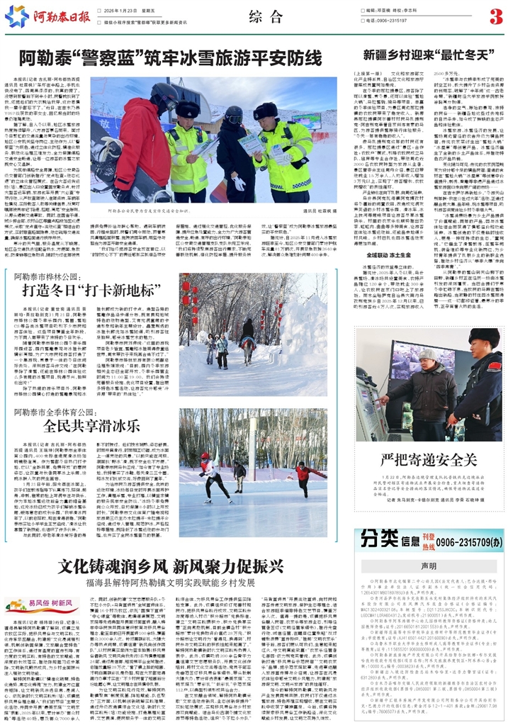 “我们始终把游客安全放在首位,以‘时时放心不下’的责任感抓实抓细各项安保措施。通过强化交通管控、优化服务保障、提升应急处置能力,全力为广大游客营造安全、畅通、有序的出行环境。”阿勒泰地区公安局交通管理支队支队长庞卫东说,“我们将持续聚焦游客出行需求,不断完善联动机制、细化防控举措、提升服务质效,让‘警察蓝’成为阿勒泰冰雪旅游最坚实的平安底色。”