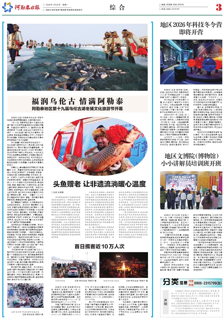 - 头鱼赠老 让非遗流淌暖心温度 □记者 古丽娜 在阿勒泰地区第十九届乌伦古湖冬捕文化旅游节上,一条重达18.8公斤的头鱼没有如往年一样走上竞拍席,而是被郑重赠予当地敬老院。这
