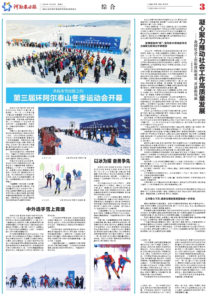 - 第三届环阿尔泰山冬季运动会开幕 本报讯(记者 董世菊 张楠 张福新 阿尔达克·拜斯汗)冰雪为媒,丝路相连。1月27日,2026年第三届“冰雪丝路 中国雪都”环阿尔泰山冬季运动会在阿勒泰市萨尔阔