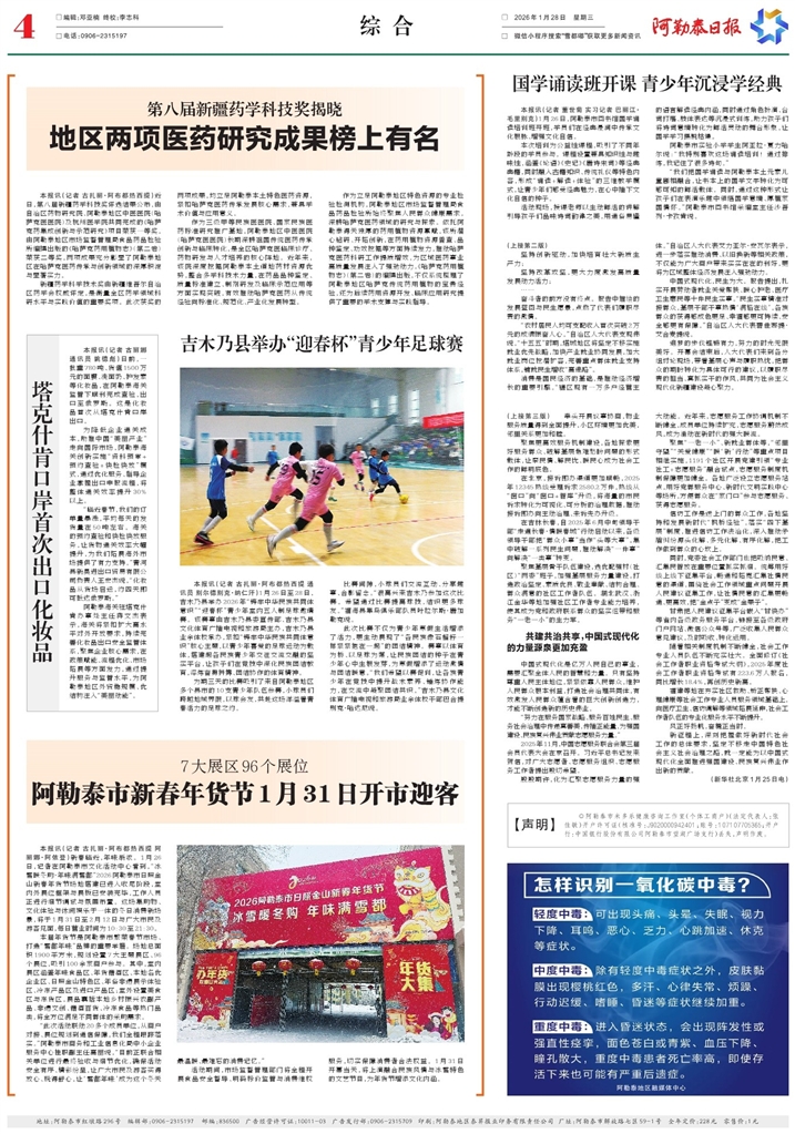 - 国学诵读班开课 青少年沉浸学经典 本报讯(记者 董世菊 实习记者 巴丽江·毛里别克)1月26日,阿勒泰市图书馆国学诵读培训班开班,学员们在经典浸润中传承文化根脉、增强文化自信。 本次培训为公益性课程,吸引了不同年龄