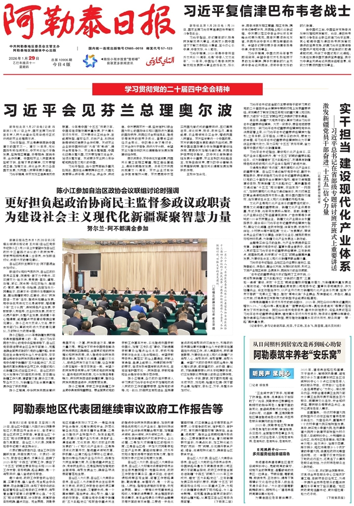 • 阿勒泰地区代表团继续审议政府工作报告等         本报讯(记者 常轶茹 王景鸿)1月28日,自治区十四届人大四次会议阿勒泰地区代表团召开全体会议,继续审议自治区政府工作报告、审查自治区“十五五”规划纲要草案、计划报告、预算报告及其草案