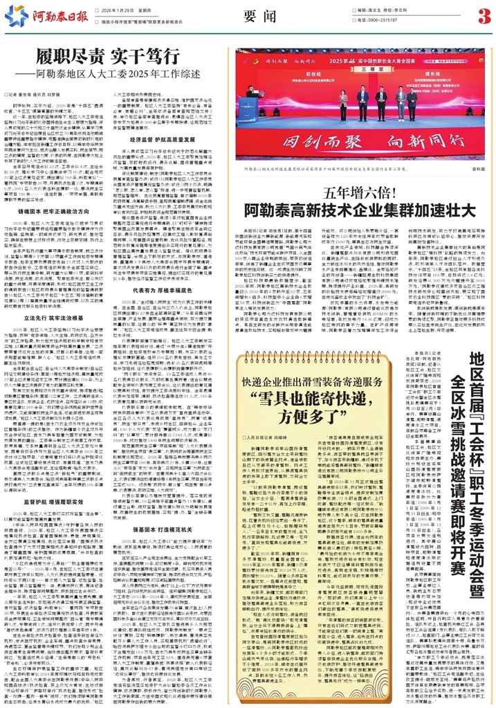 - 地区首届“工会杯”职工冬季运动会暨全区冰雪挑战邀请赛即将开赛 本报讯(记者 古扎丽·阿布都热西提)日前,记者从地区工会、地区文化体育广播电视和旅游局获悉,2026年阿勒泰地区首届“工会杯”职工冬季运动会暨全区冰雪挑战邀请赛将于1月30日至2月3日举行。赛事设