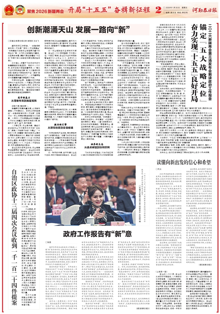 - 政府工作报告有“新”意 □张磊 翻开今年的自治区政府工作报告,一股“新”意扑面而来,它既是对过往五年砥砺深耕的凝练总结,更是开启“十五五”崭新征程的豪迈宣言。报告以宏阔的视野与翔实的数据,全景展现出
