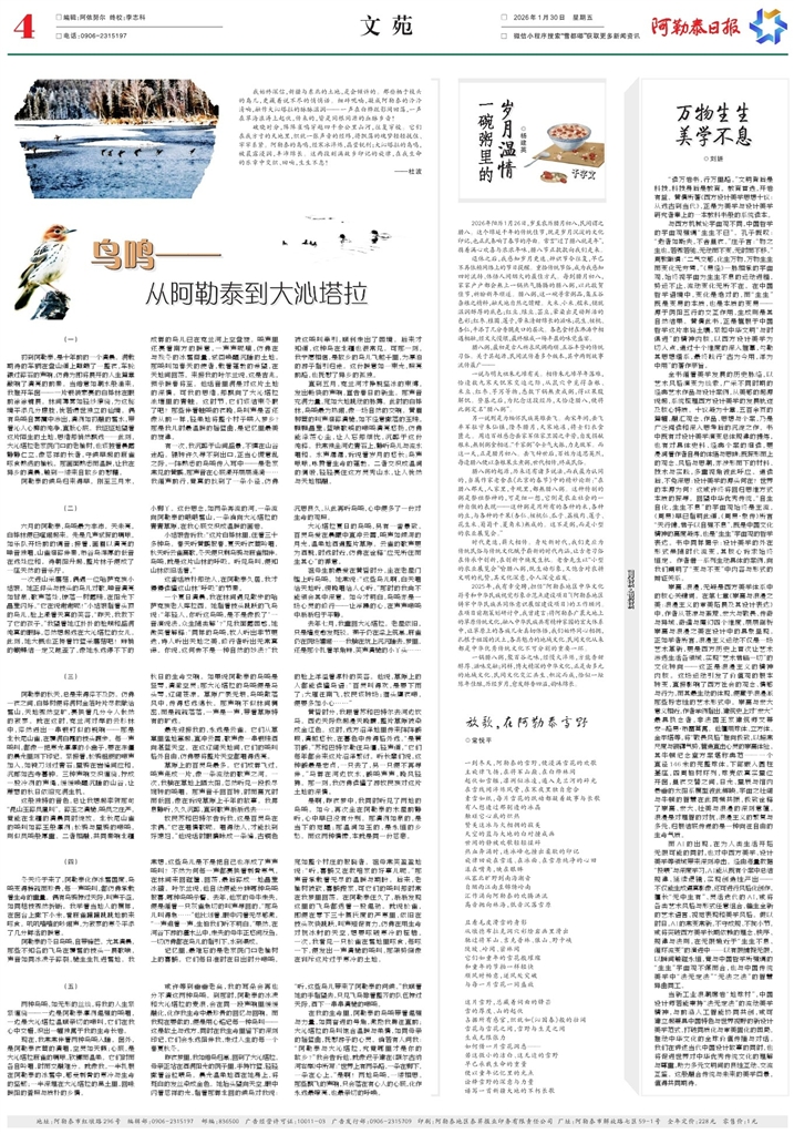 - 鸟鸣——从阿勒泰到大沁塔拉 我始终深信,新疆与东北的土地,是会倾诉的。那些栖于枝头的鸟儿,更藏着说不尽的悄悄话。细碎呢喃,凝成阿勒泰的泠泠清响,融作大沁塔拉的脉脉温润——一声在白桦疏影间回荡,一声在草海浪涛上起伏,传来的,